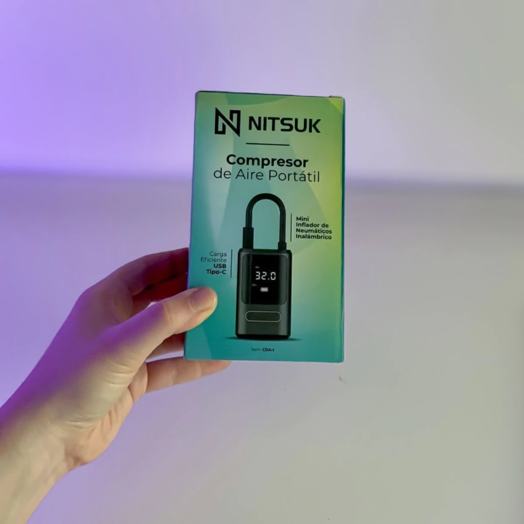 Cuenta con un display digital que permite ajustar la presión según la necesidad, asegurando un inflado rápido y potente. Incluye múltiples boquillas adaptables para diferentes usos: manguera para autos y motos, boquilla para bicicletas, pelotas, globos y colchones.