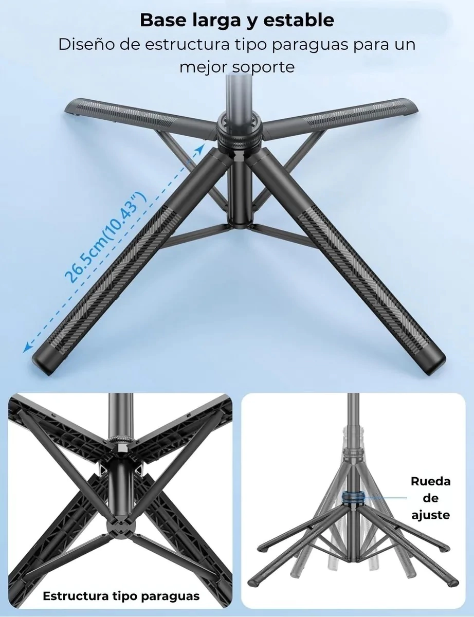 Con una estructura tipo paraguas de cuatro patas, este cuadrípode ofrece máxima estabilidad incluso en alturas de hasta 1,80 m y durante grabaciones prolongadas. Su diseño antivibraciones asegura tomas firmes y fluidas, superando a muchos estabilizadores tradicionales.